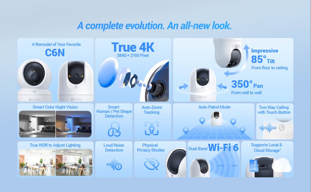 WiFi băng tần kép 2.4/5GHz kết nối nhanh. Hỗ trợ thẻ MicroSD 512GB lưu video dài ngày. Tương thích app EZVIZ trên iOS/Android.